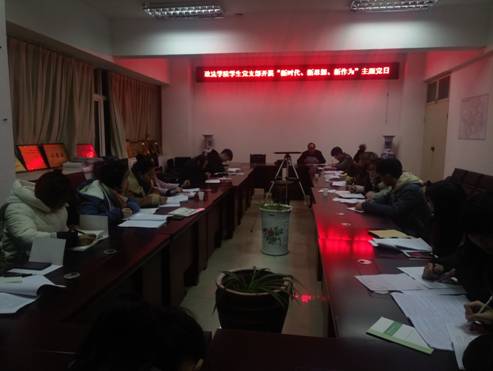为了贯彻落实学习十九大精神,引领学生成长成才。2017年12月11日晚上19:00,政法学院党总支学生党总支部在政法学院会议室召开了以“新时代、新思想、新作为”为主题党日活动。出席本次活动的有政法学院党总支学生党总支部书记罗宪志以及政法学院学生预备党员、入党积极分子代表。