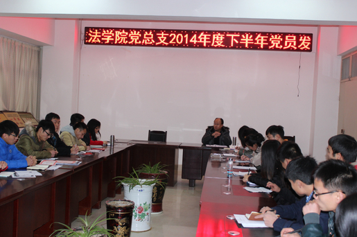 2014年12月12日,政法学院在会议室召开了2014年度的党支部党员发展大会。政法学院党总支书记徐忠主持了本次会议。在本次会议上,赵飞、孙娜、邓世春等8位积极分子,被发展为预备党员,预备期满的王前珍、田维丹,黄俊等11位同志如期转正。