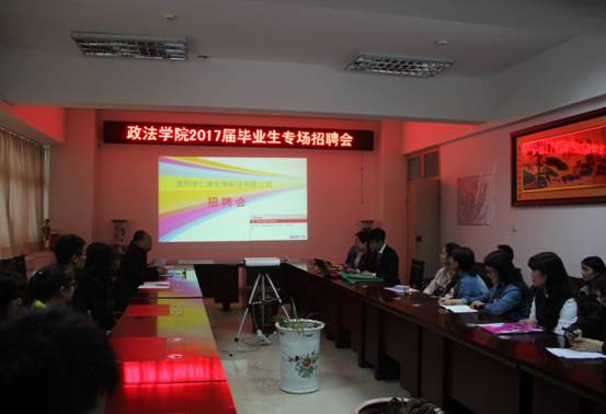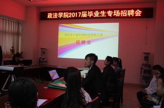 4月25日上午十点,贵阳寿仁康生物科技有限公司到政法学院会议室开展专场招聘会。参加此次招聘会的有寿仁康生物科技有限公司总经理王豪、助理徐女士和汪女士,政法学院院长徐忠、党总支副书记崔晓莉、老师岑英武以及2017届政法学院应届毕业生约50人。