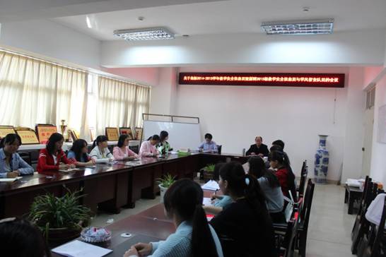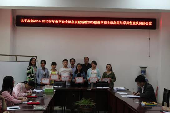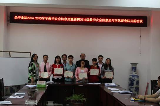 会议首先由瞿家儒主任宣读2014-2015学年教学安全信息员考核结果。经过学生的自评、教师评议和学院领导综合评审,确定政法学院优秀教学安全信息员3名,优秀学风督查队员3名。