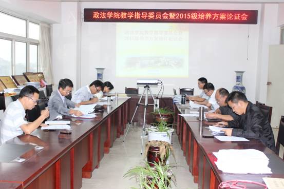 2015年8月28日,政法学院召开教学指导委员会暨2015级培养方案论证会,政法学院党总支书记兼院长徐忠,副院长胡必坚、副院长余治平、政法学院教学指导委员会委员参加了本次论证会。会议由政法学院副院长余治平主持,思想政治教育教研室主任张俊祥、法学教研室主任邓肄、社会工作教研室主任彭建斌分别介绍了相关专业培养方案的修订情况,政法学院教学指导委员会各位委员就培养方案的修订内容进行讨论,形成了一致看法,认为2015级培养方案应尽量删减学时,总学时应控制在2300左右,总学分控制在170以内,加大实践课程占总学分的比重。