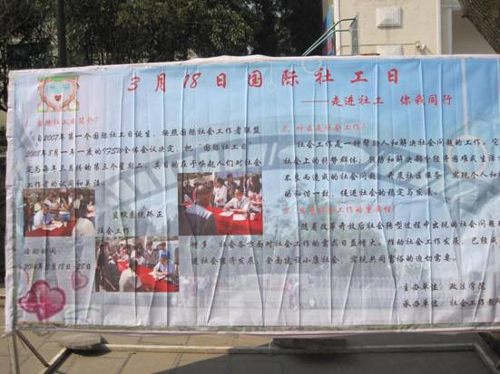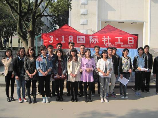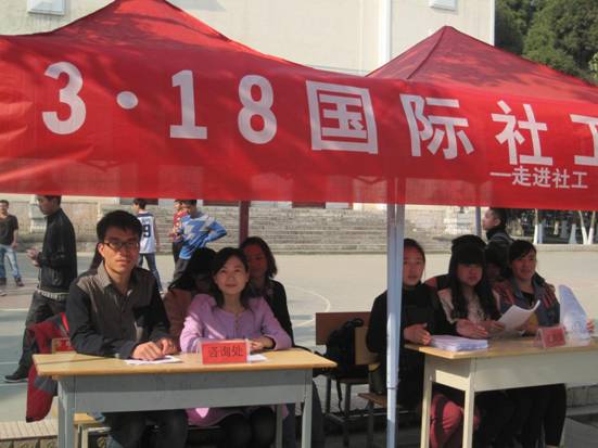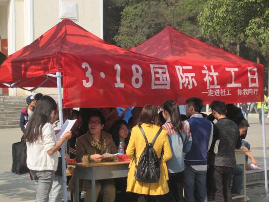 今年3月18日是第8个国际社工日,这是全世界社会工作者的共同节日,也是宣传、推广社会工作的有利时机。按照《民政部办公厅关于开展2014年国际社工日主题宣传活动的通知》精神,2014年3月18日下午,政法学院2012级与2013级的社会工作专业同学在政法学院教师的组织安排下,经历四个多小时在学校开展普及社会工作知识的主题宣传活动。通过制作宣传栏、普及社会工作知识、设立咨询点、发放宣传品等方式,为弘扬社会工作精神,传播社会工作知识,展示社会工作者风采,关爱社会工作者成长,提升社会工作职业地位,提高广大公众对社会工作的知晓度、认同度和参与度,切实推动社会工作走入社会、走进大众、走向基层,努力营造社会工作发展的良好舆论氛围和社会环境起到了重要作用,很多同学纷纷向社会工作专业教师和同学咨询有关社会工作的知识,活动取得了良好效果。