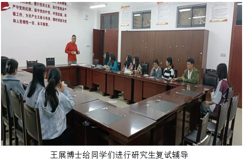 王展博士首先鼓励同学们要树立信心,要有拼搏的精神,认真备战研究生复试;随后对研究生复试的环节、需要注意的事项逐一进行了讲解;传授了研究生复试的一些方法和技巧。