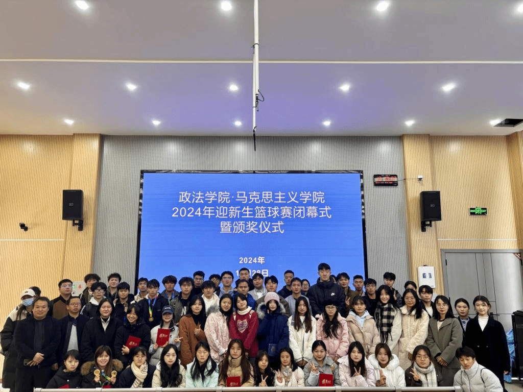 随着最后一场冠军争夺赛的结束,“2024年政法•马院迎新生篮球比赛”圆满收官。为表彰各参赛队伍的出色表现,政法学院与马克思主义学院于11月28日在乐学楼阶梯教室举办了颁奖仪式,政法学院党委书记潘昌盛,马克思主义学院党委副书记潘光才,政法学院团总支书记潘桂芳,专职辅导员伍远远以及政法学院、马克思主义学院参加比赛的同学参加了本次颁奖仪式。