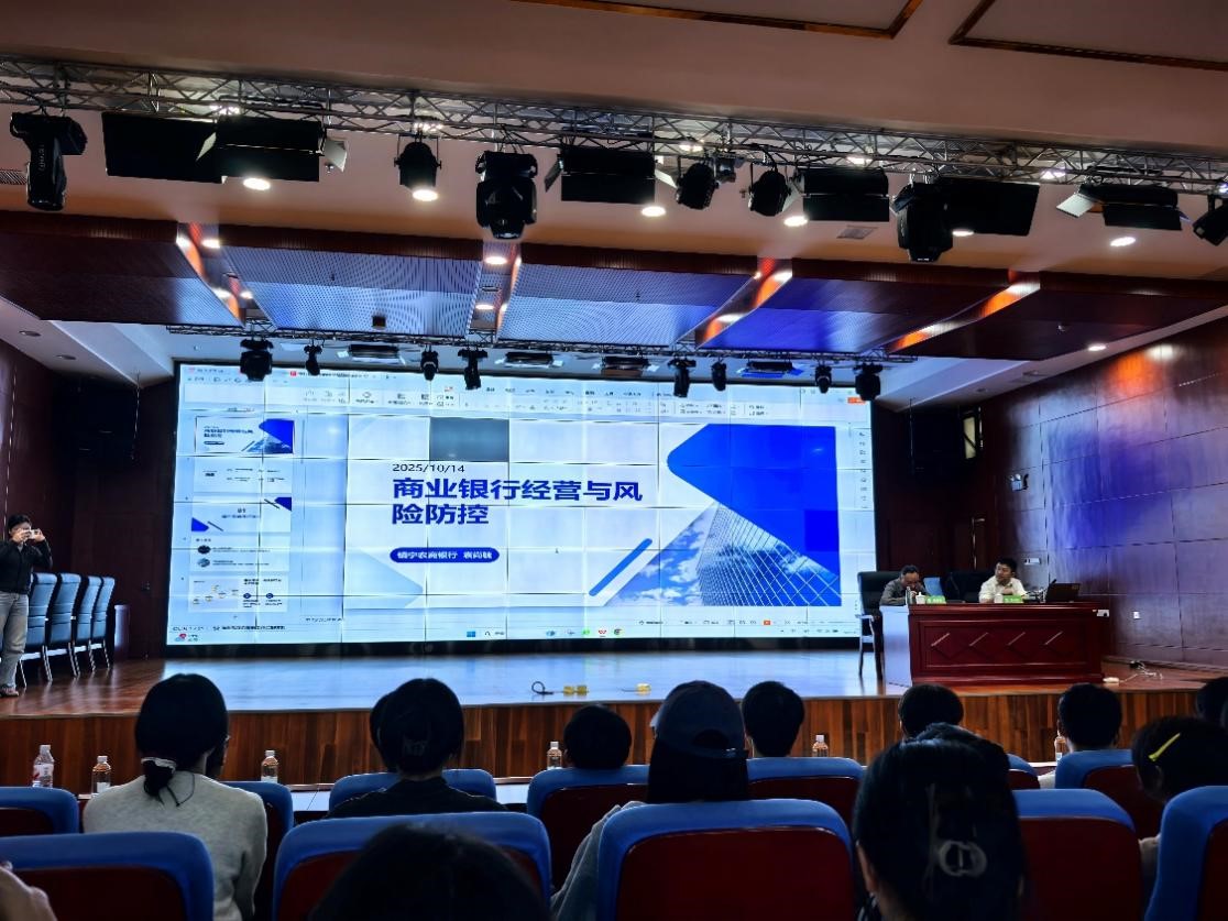 师生一行进入银行后,首先由工作人员介绍大厅各职能部门分工,直观了解银行服务流程与岗位设置。随后,袁尚毓总监围绕“商业银行经营与风险防控”开展专题讲解,从四方面深入分享:一是镇宁农商银行发展历程与业务布局;二是银行信贷、结算等核心业务运作机制;三是信用风险识别、评估与防控的实操方法;四是不良资产清收的多元手段与处置法律流程。讲解结束后,学生结合课程疑问积极提问,就“抵押财产处置细节”“逾期催收法律边界”等问题与企业导师深入交流。