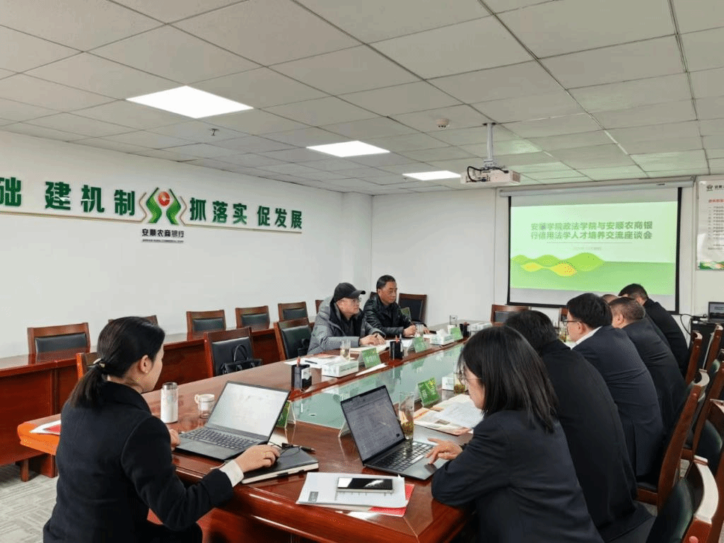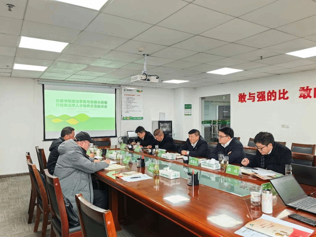 12月20日上午,安顺学院政法学院院长徐忠教授,法学教研室李先龙教授、潘继材老师一行赴安顺农村商业股份有限公司参加信用法学人才培养交流座谈会,安顺农商行董事长江弘、行长谭振发、副行长陈优凯及各部门领导出席本次座谈会。