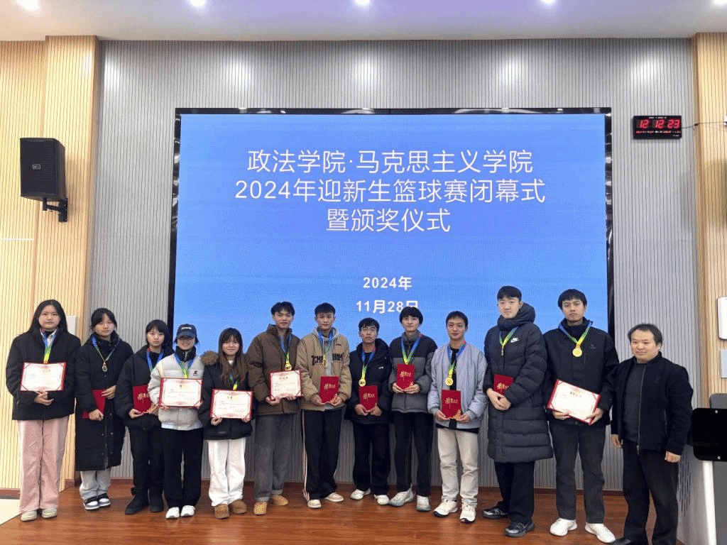 随着最后一场冠军争夺赛的结束,“2024年政法•马院迎新生篮球比赛”圆满收官。为表彰各参赛队伍的出色表现,政法学院与马克思主义学院于11月28日在乐学楼阶梯教室举办了颁奖仪式,政法学院党委书记潘昌盛,马克思主义学院党委副书记潘光才,政法学院团总支书记潘桂芳,专职辅导员伍远远以及政法学院、马克思主义学院参加比赛的同学参加了本次颁奖仪式。
