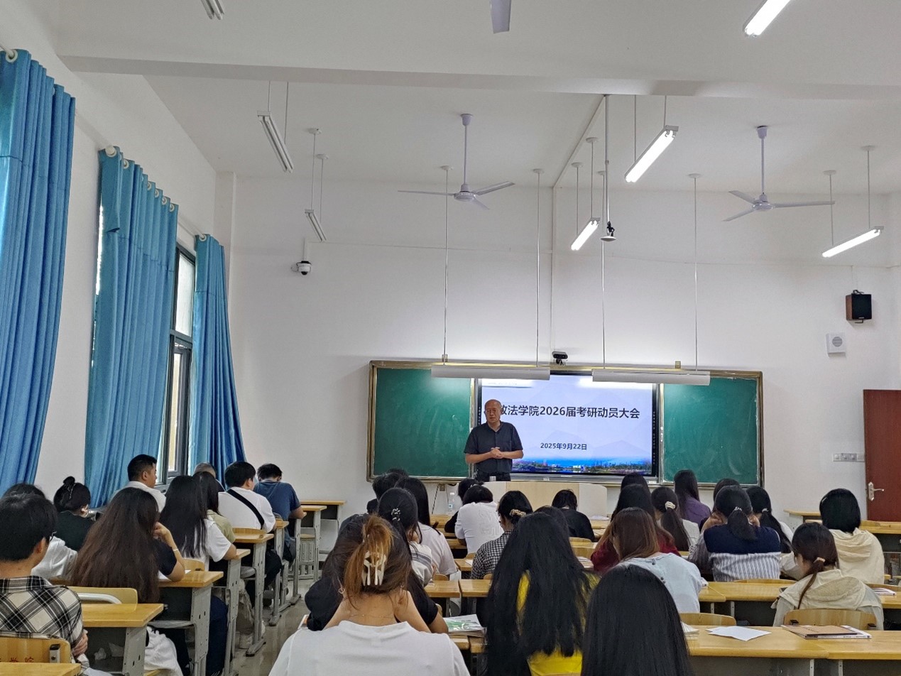 9月22日下午,政法学院在乐学楼J109教室隆重召开2026届考研动员大会。学院院长徐忠、专职副书记尹科、团总支书记潘桂芳、专职辅导员伍远远、2022级信用风险与法律防控专业班主任简训友及2026届全体学生共同参加了此次大会。